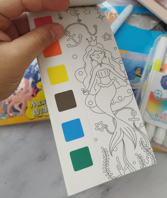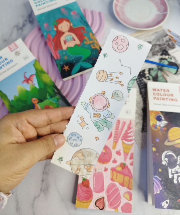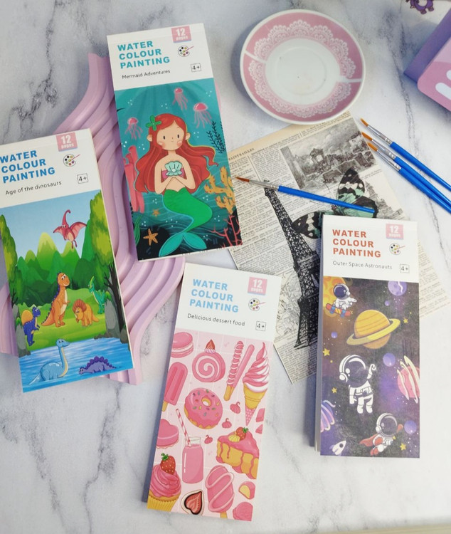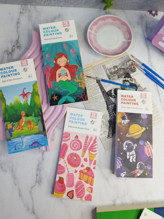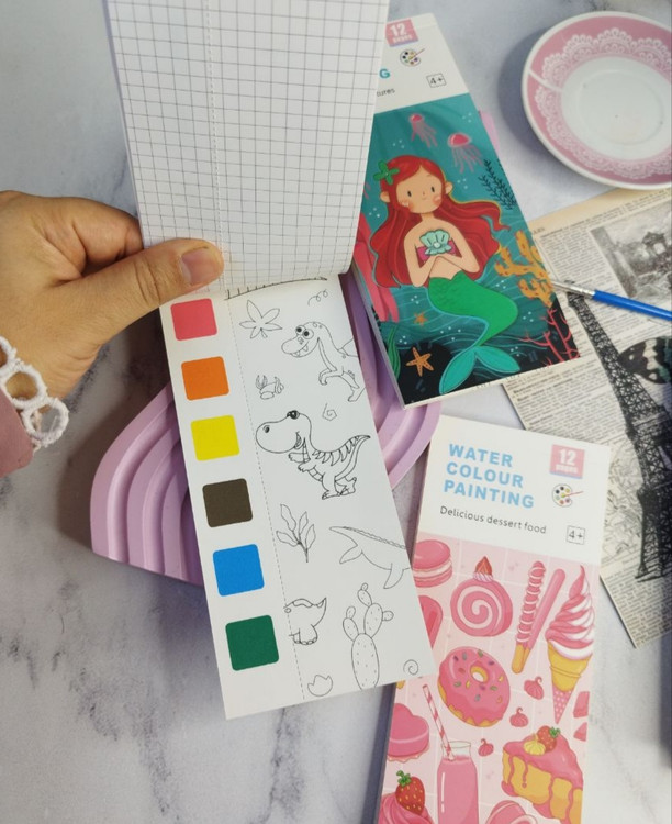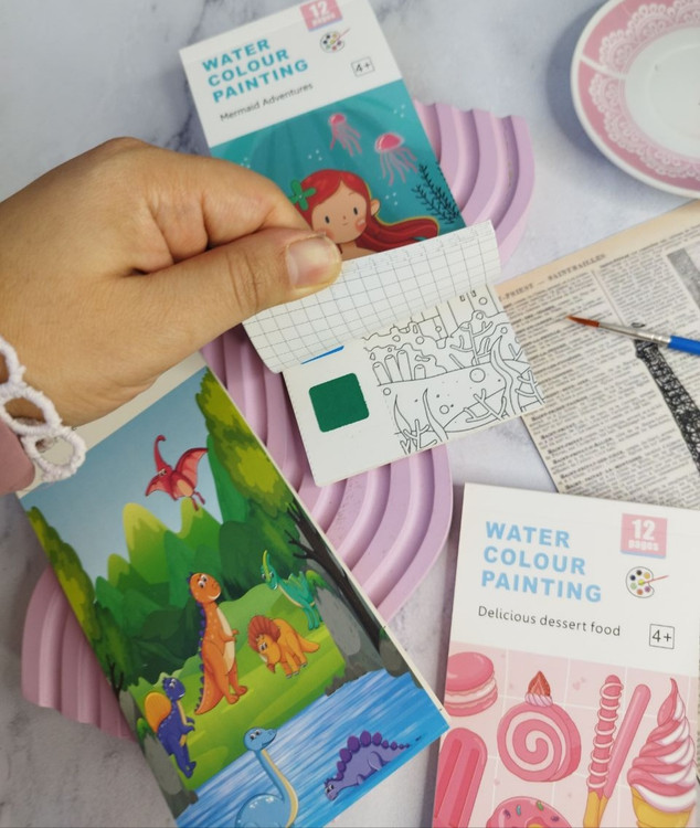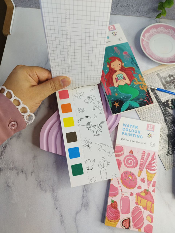 هر دفترچه ۱۲ برگ داره که هر برگه خودش آبرنگ کنار نقاشی داره که شما راحت با آبرنگ خود صفحه نقاشی را رنگ بزنید یک قلمو همراه دفترچه هست