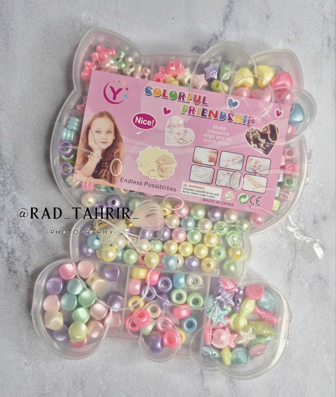 هر بسته کلی مهره متفاوت رنگی رنگی داره به همراه مقداری نخ مخصوص و جعبه نظم دهنده خدمتتون ارسال میشه